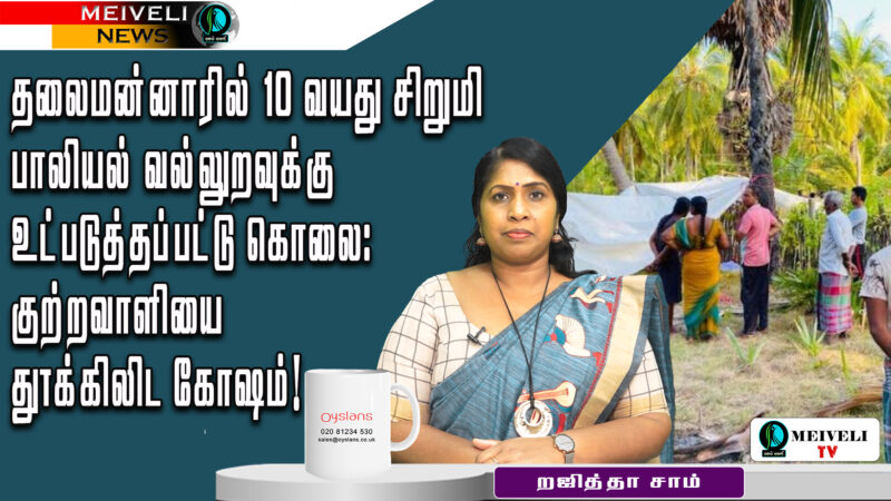 0% 0 தலைமன்னாரில் 10 வயது சிறுமி பாலியல் வல்லுறவுக்கு உட்படுத்தப்பட்டு கொலை: குற்றவாளியை தூக்கிலிட கோஷம்! view more